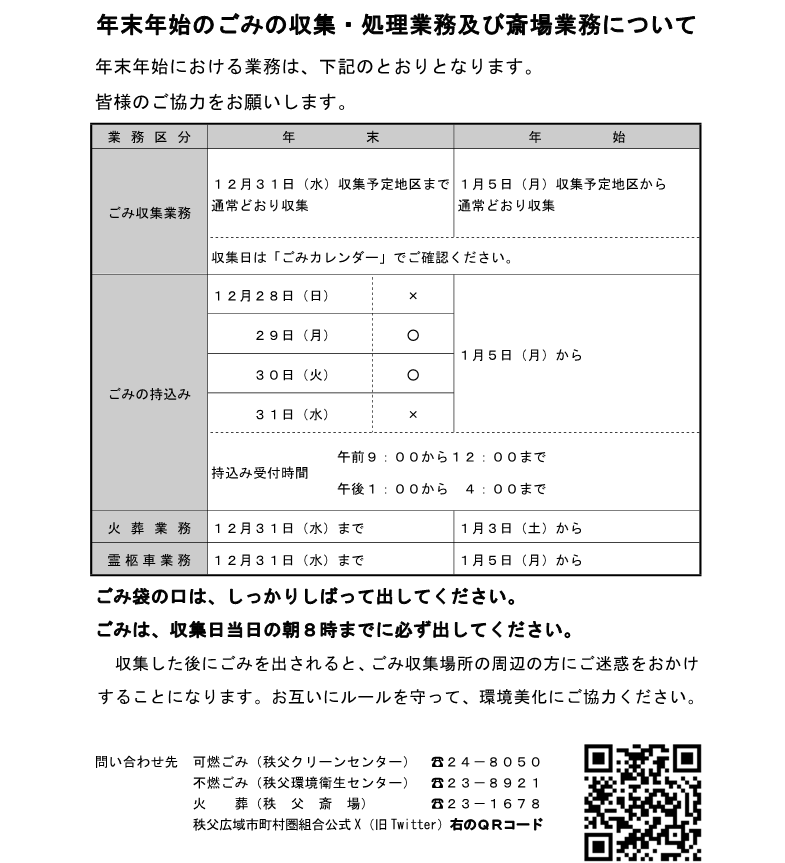 年末年始のごみ収集、ごみ処理施設(秩父クリーンセンター、秩父環境衛生センター)、秩父斎場の業務は、次の表のとおりとなります。