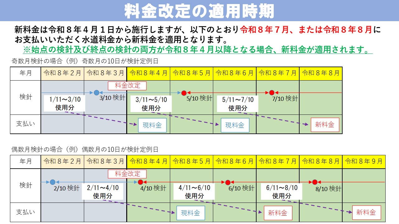⇒令和8年4月1日以降に使用を開始した水栓の水道料金は、令和8年4月検針分から適用になります。